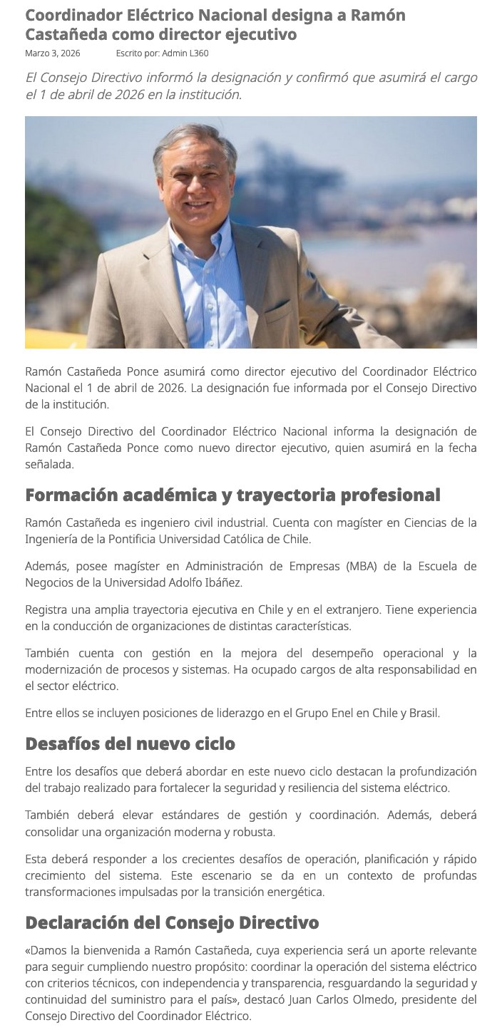 Coordinador Eléctrico nombra a Ramón Castañeda como nuevo director ejecutivo - (nuevaminería online)