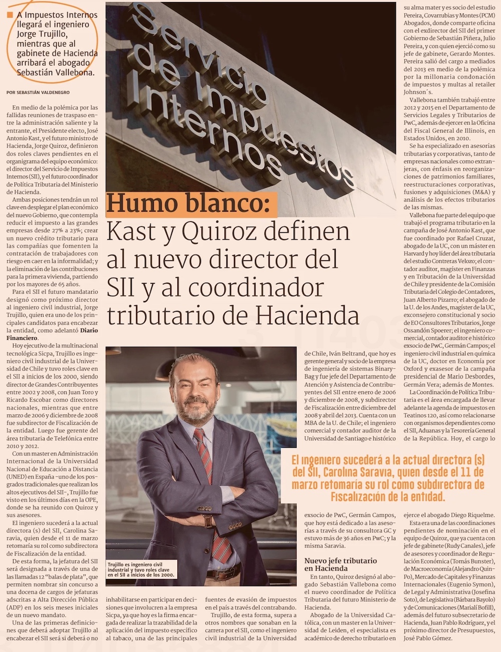 Kast ocupa dos “balas de plata” para el SII y la DT, y realiza primer “gabinete” económico para delinear hoja de ruta - (Pulso)