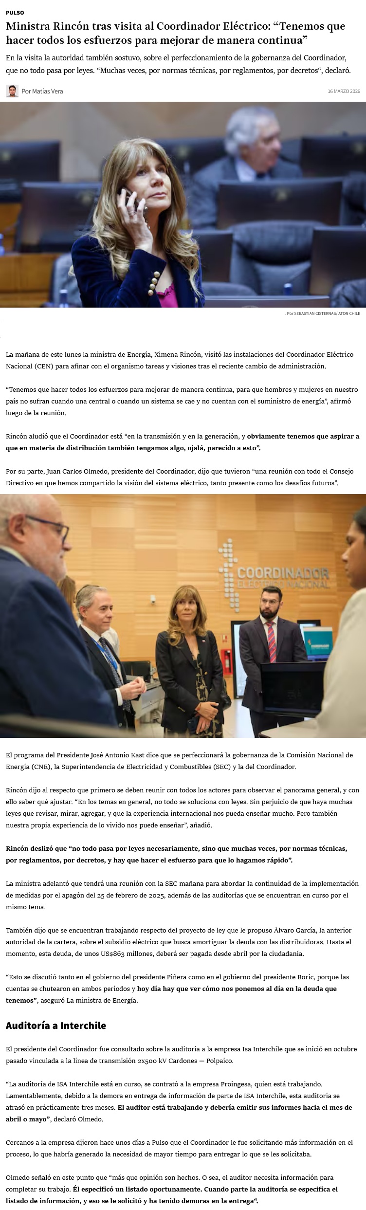 Ministra Rincón sostiene reunión con el Coordinador Eléctrico Nacional - (estapasando.cl)