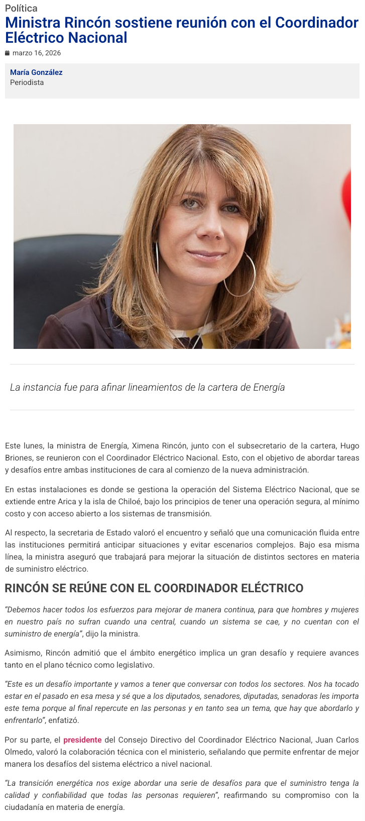 Ministra Rincón tras visita al Coordinador Eléctrico: “Tenemos que hacer todos los esfuerzos para mejorar de manera continua” - (La Tercera Online)