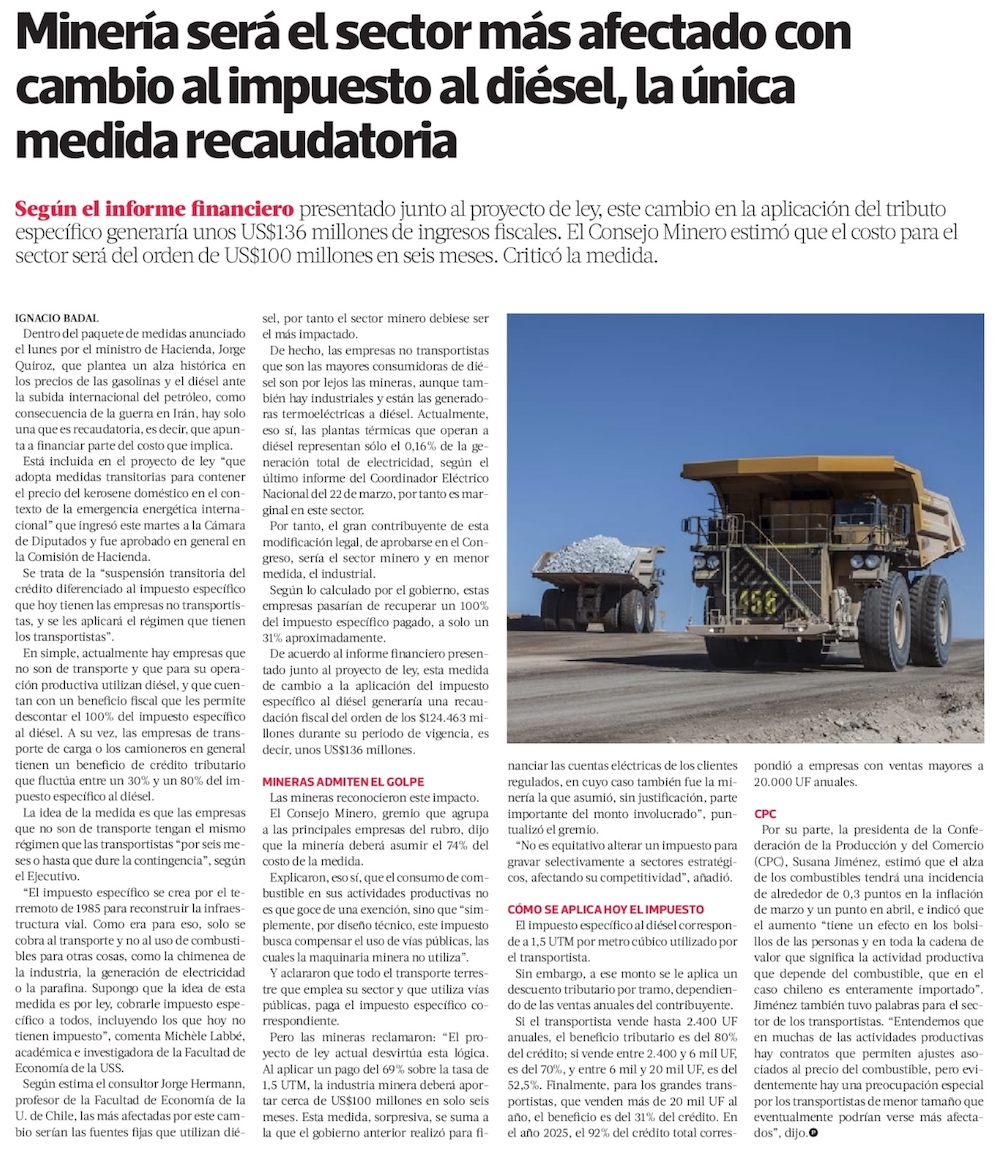 Minería e industria serían los sectores más afectados con cambio al impuesto al diésel, la única medida recaudatoria - (La Tercera Online)