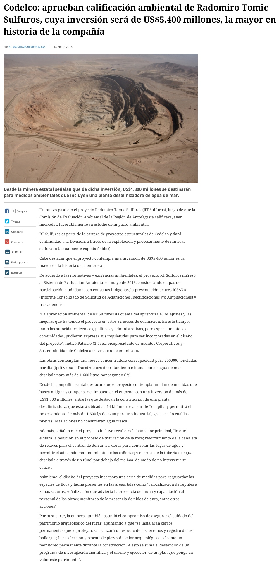 Aprueban por unanimidad la puesta en marcha de RT Sulfuros Fase II - (El Mercurio de Calama)