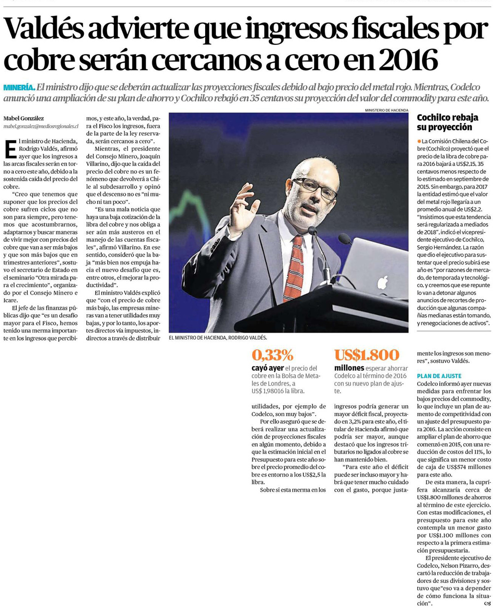 Valdés advierte que ingresos fiscales por el cobre serán cercanos a cero en 2016 - (El Mercurio de Valparaíso)