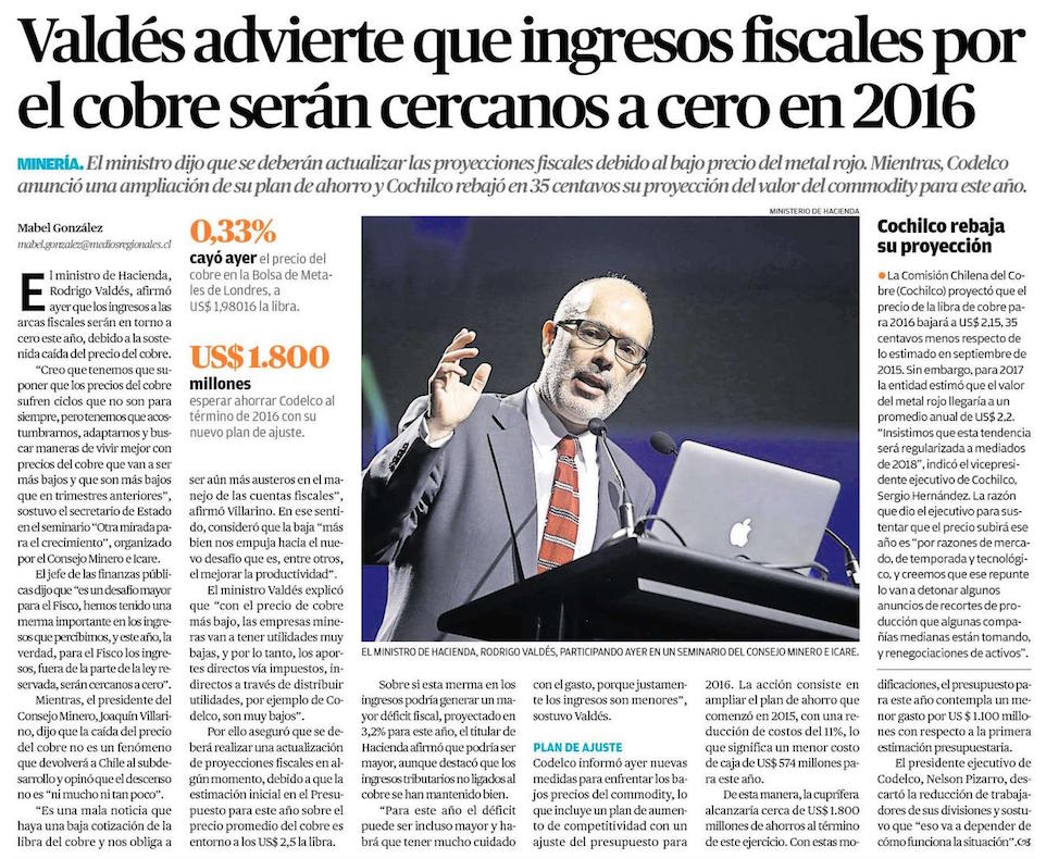 Valdés advierte que ingresos fiscales por el cobre serán cercanos a cero en 2016 - (El Mercurio de Valparaíso)