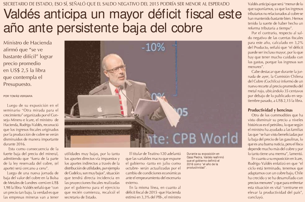 Hacienda adelanta revisión de escenario fiscal 2016 por desplome del precio del cobre - (Pulso)