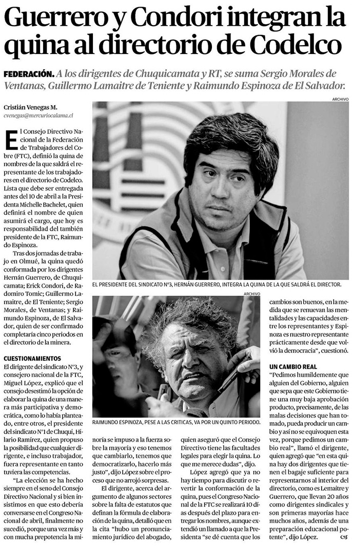 Trabajadores de Codelco proponen quina al gobierno por cupo en directorio - (La Tercera)
