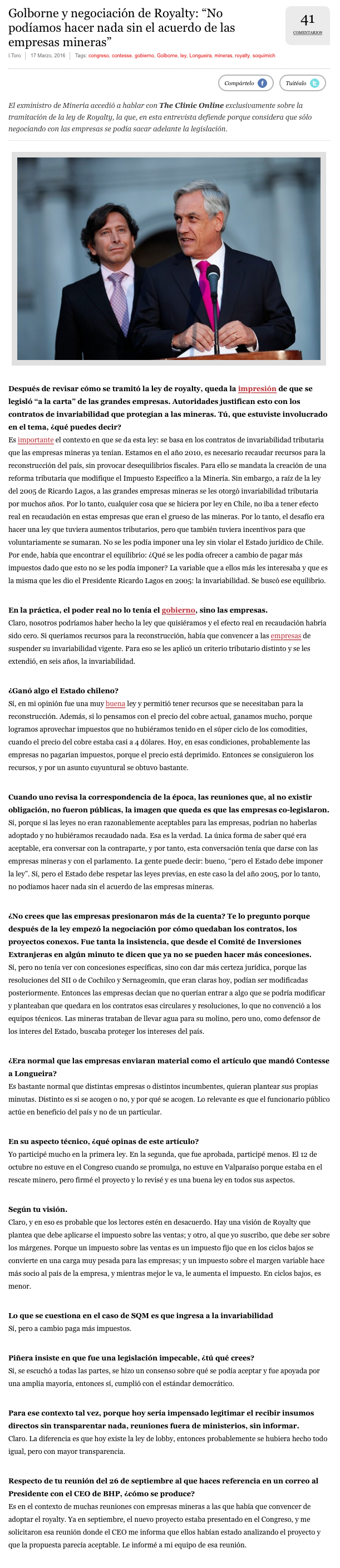 Golborne admite que firmas co-legislaron Royalty: “No podíamos hacer nada sin el acuerdo de las mineras” - (DF Online)