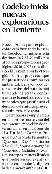 Codelco entra a evaluación proyecto para nuevos yacimientos en El Teniente - (El Mercurio de Santiago)