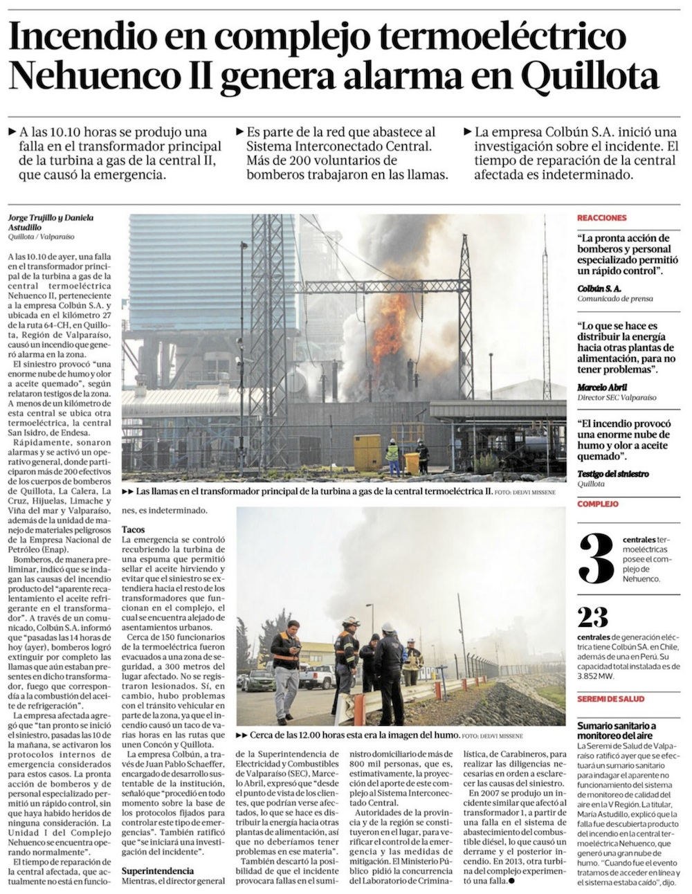 Fiscalía pide pericias a Labocar para aclarar incendio en Nehuenco - (El Mercurio de Valparaíso)