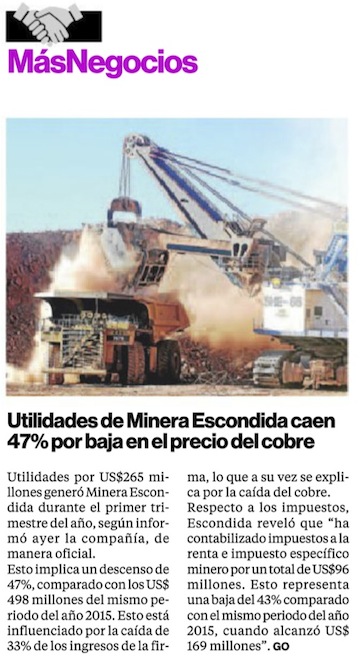 Menor producción y baja en precio del cobre impactan resultado operacional de Escondida - (mch.cl)