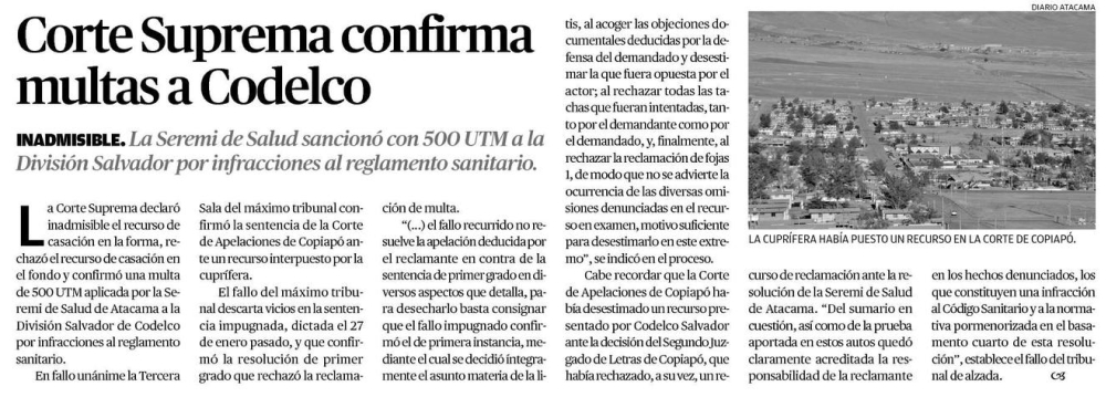 Corte Suprema confirma multa de 500 UTM a Codelco - (La Tercera)