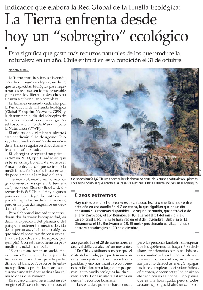 Informe advierte que déficit ecológico de Chile comenzará en octubre - (La Tercera)