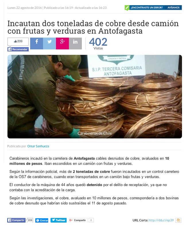 En control carretero detectaron carga de dos toneladas de cobre - (El Mercurio de Antofagasta)