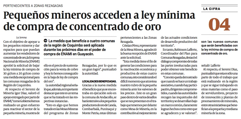 Fijan ley mínima de compra de concentrado de oro a pequeños mineros en Enami Guayacán - (La Región)