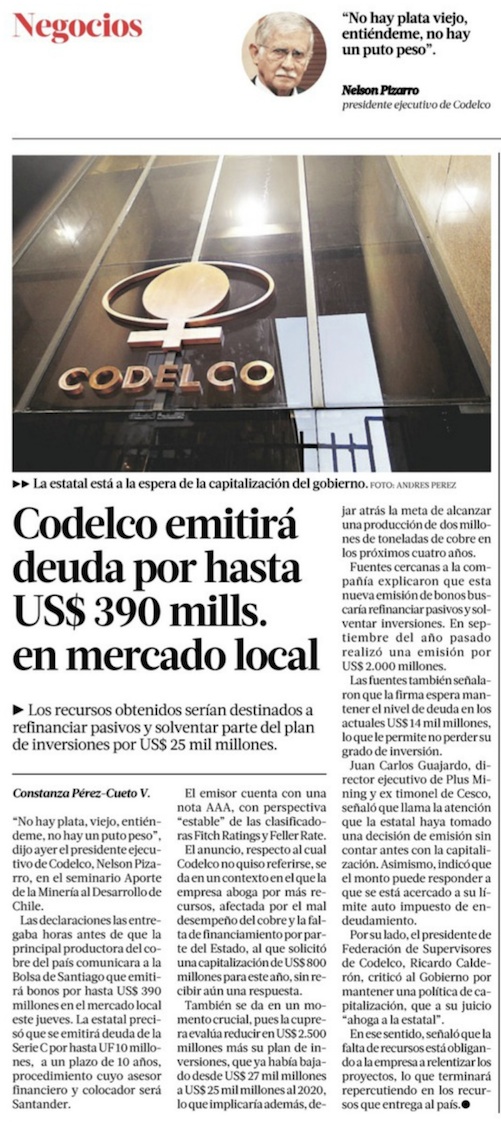 Codelco: crítica situación la obliga a colocar bono por hasta US$ 390 millones - (Diario Financiero)