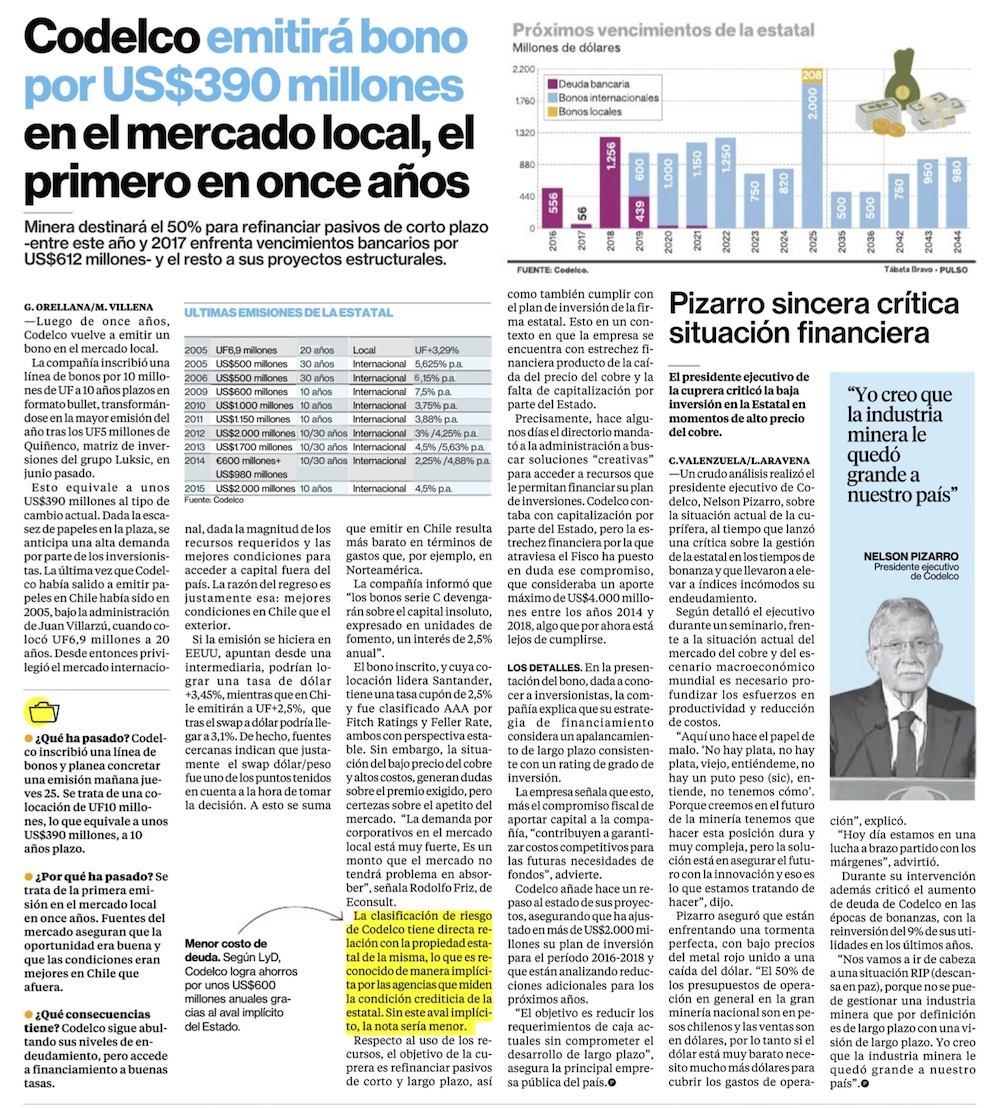 Codelco emitirá deuda por hasta US$ 390 mills. en mercado local - (La Tercera)