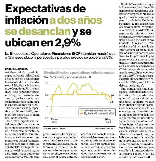 Se consolida en el mercado proyección de inflación bajo el 3% en el mediano plazo - (Diario Financiero)