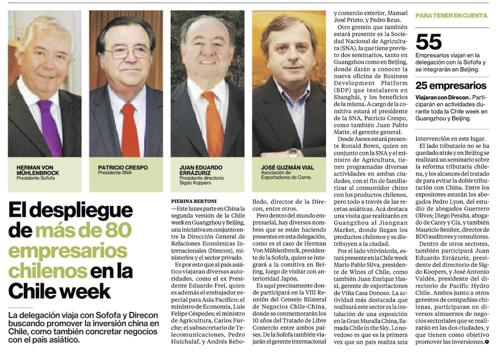 Empresarios y autoridades chilenas viajan a China en el marco del décimo aniversario del TLC con el gigante asiático - (El Mercurio de Santiago)
