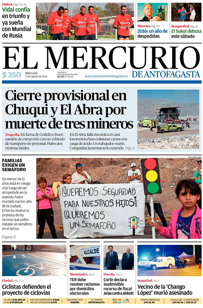 Ordenan cierre temporal de Chuquicamata y El Abra por muerte de tres trabajadores - (El Mercurio de Santiago)