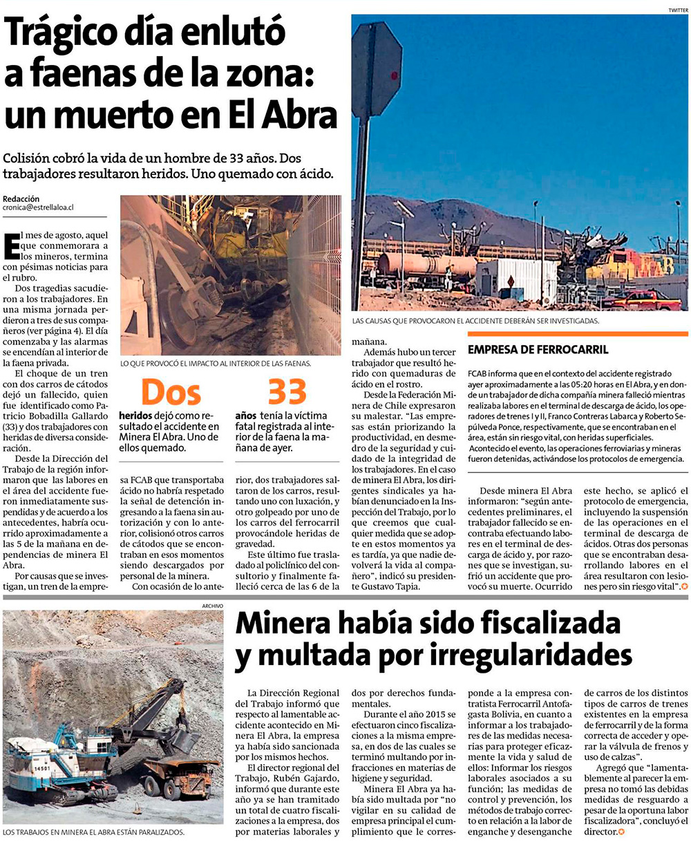Dos muertos en Chuquicamata y uno en El Abra por accidentes en minería - (El Mercurio de Antofagasta)
