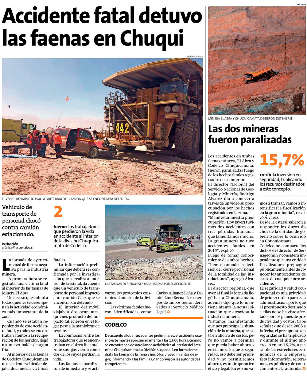 Dos muertos en Chuquicamata y uno en El Abra por accidentes en minería - (El Mercurio de Antofagasta)