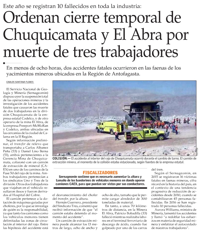 Dos muertos en Chuquicamata y uno en El Abra por accidentes en minería - (El Mercurio de Antofagasta)