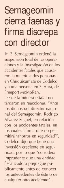 Ordenan cierre temporal de Chuquicamata y El Abra por muerte de tres trabajadores - (El Mercurio de Santiago)