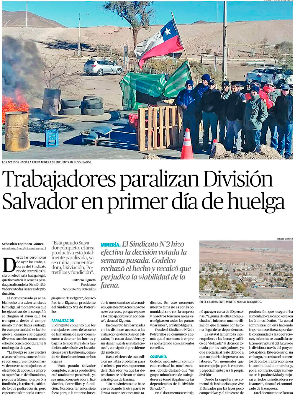 Codelco: trabajadores de Salvador inician huelga y bloquean accesos - (El Mercurio de Santiago)