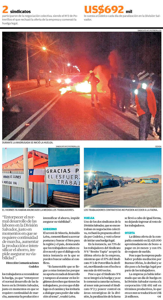 Codelco: trabajadores de Salvador inician huelga y bloquean accesos - (El Mercurio de Santiago)