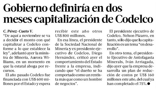 Gobierno se da hasta noviembre para decidir capitalización a Codelco - (Diario Financiero)