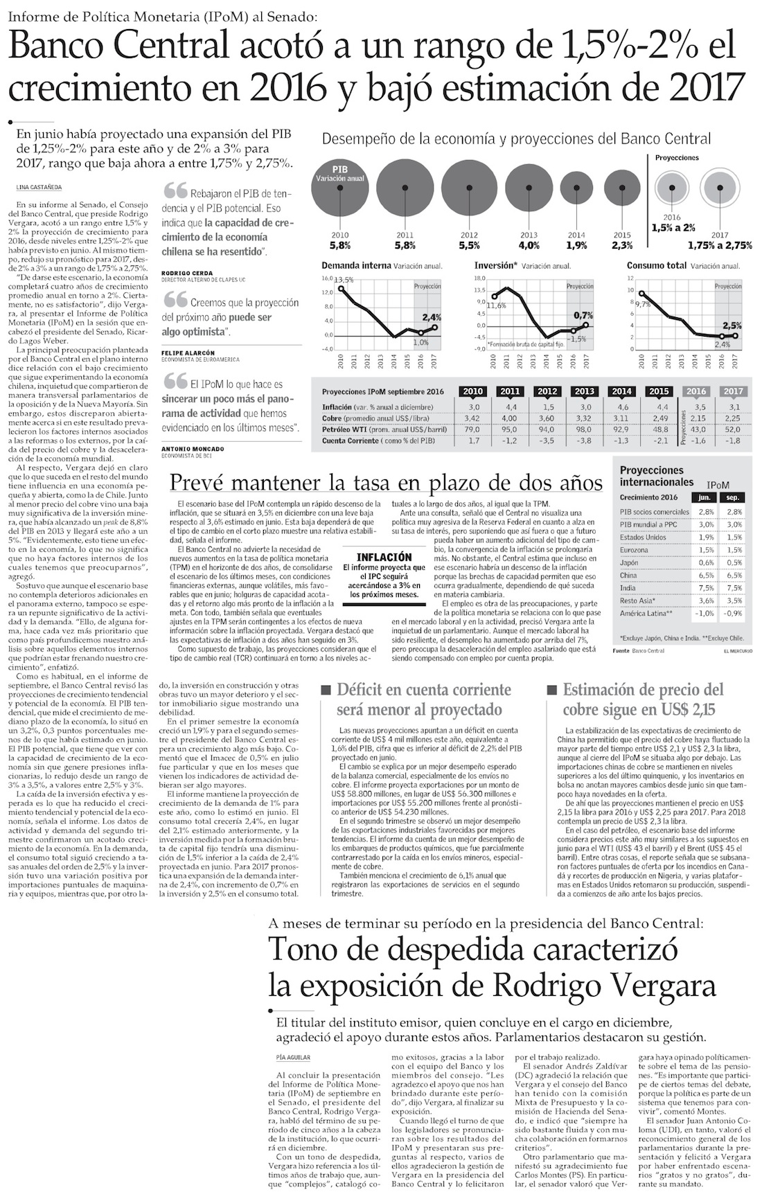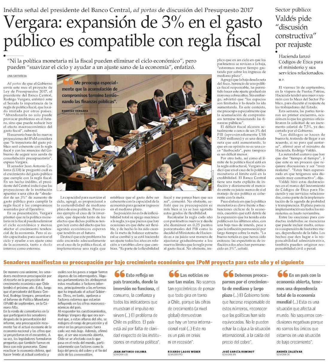 BC fija piso de crecimiento bajo 2% para 2017 y pide que gasto fiscal se sitúe en torno a 3% - (La Tercera)