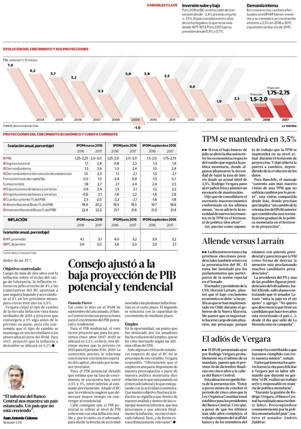 Banco Central acotó a un rango de 1,5%-2% el crecimiento en 2016 y bajó estimación de 2017 - (El Mercurio de Santiago)