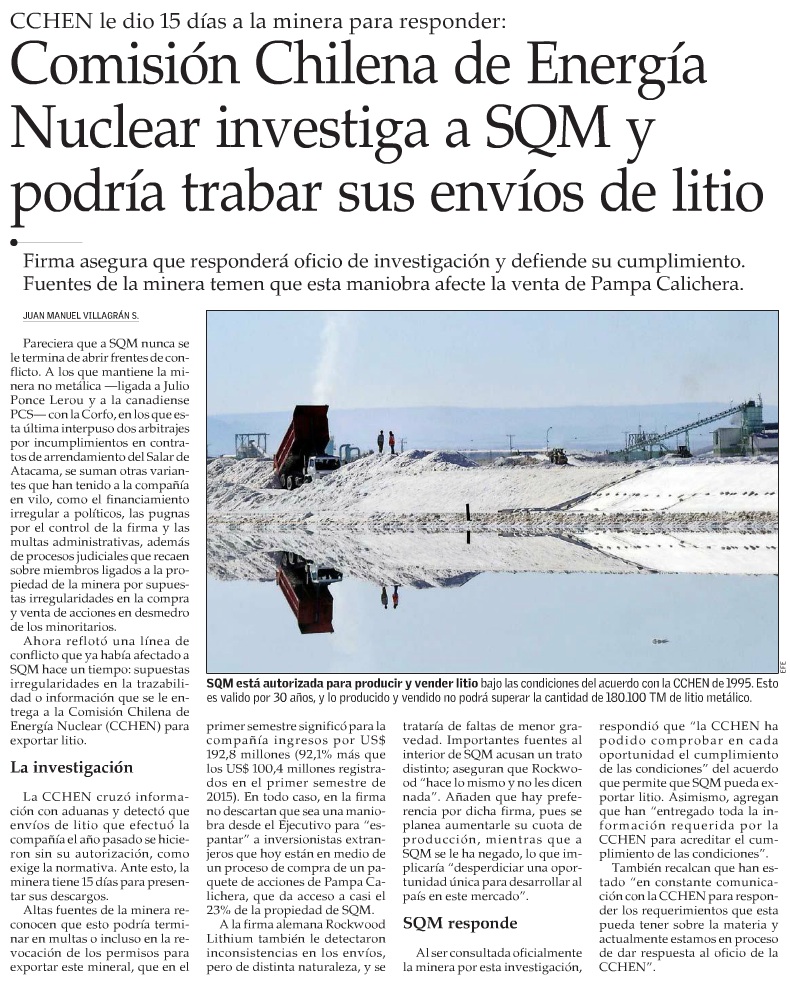 CCHEN abre investigación por exportaciones de litio de SQM y podría revocar sus permisos - (La Segunda)