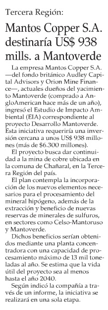 Mantos Copper inicia trámite ambiental de millonario plan para ampliar Mantoverde - (Pulso)