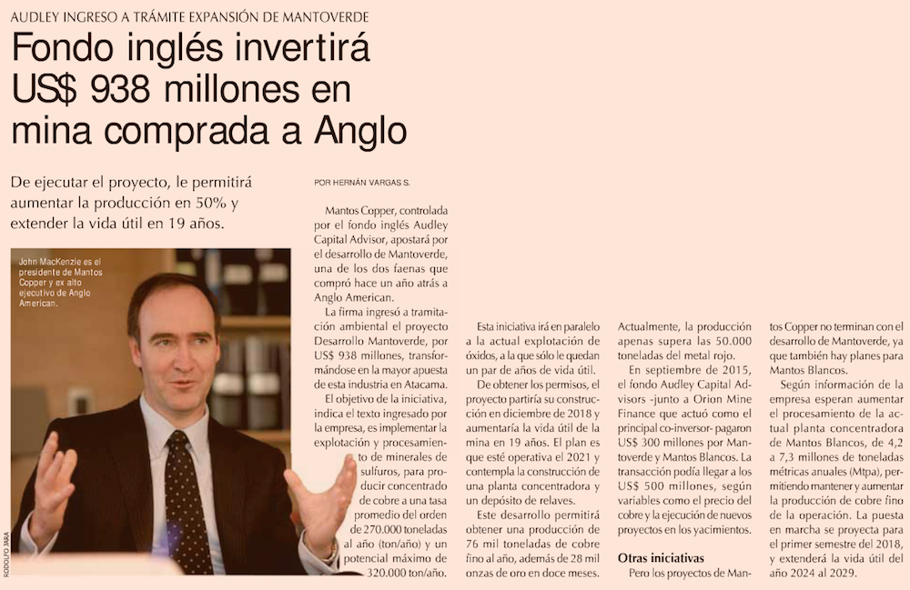 Mantos Copper S.A. destinaría US$ 938 mills. a Mantoverde - (El Mercurio de Santiago)