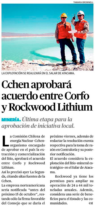 CCHEN aprobará acuerdo Rockwood-Corfo para extraer más litio desde el Salar de Atacama - (La Segunda)