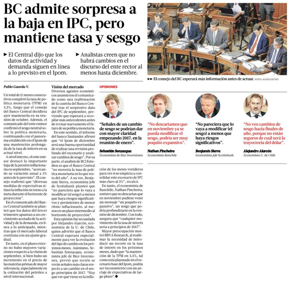 Banco Central mantiene la tasa de interés en 3.5% - (El Mercurio de Santiago)