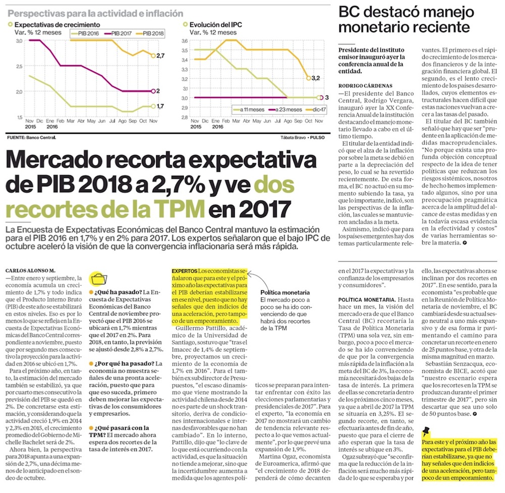 Economistas esperan dos bajas de tasas en 2017 y reducen el PIB esperado para 2018 - (Diario Financiero)