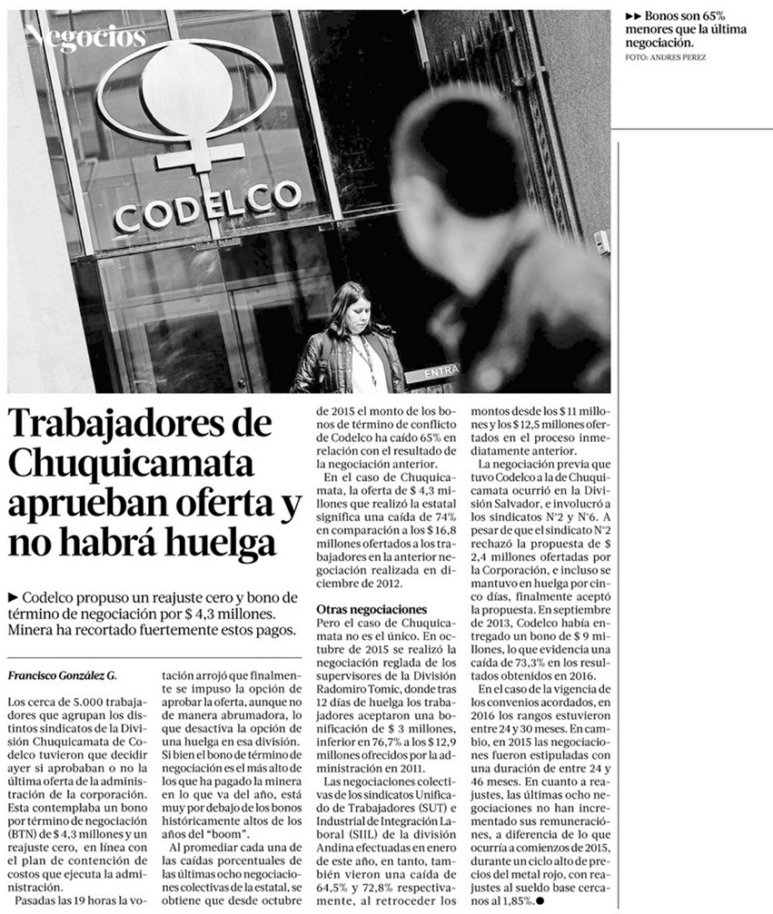 Codelco logra acuerdo con trabajadores y evita una huelga - (El Día)