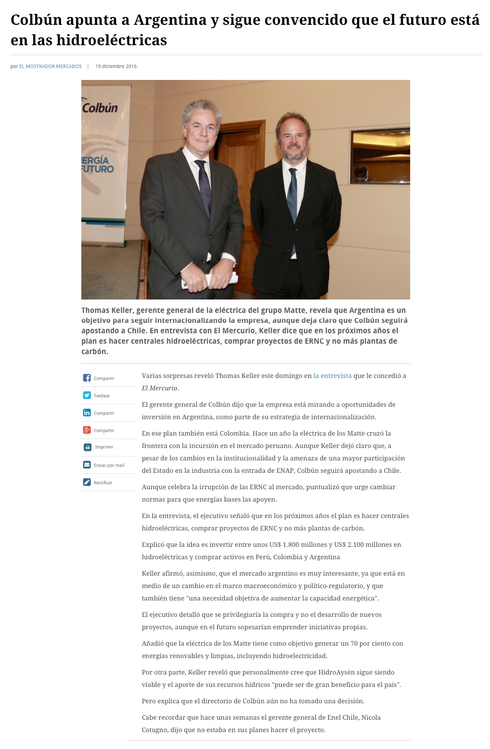 "En Colbún, lo único que queremos es hacer proyectos hidroeléctricos" - (El Mercurio de Santiago)