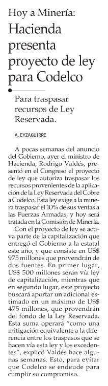 Apoyo unánime a proyecto que otorga recursos a Codelco - (La Tercera)
