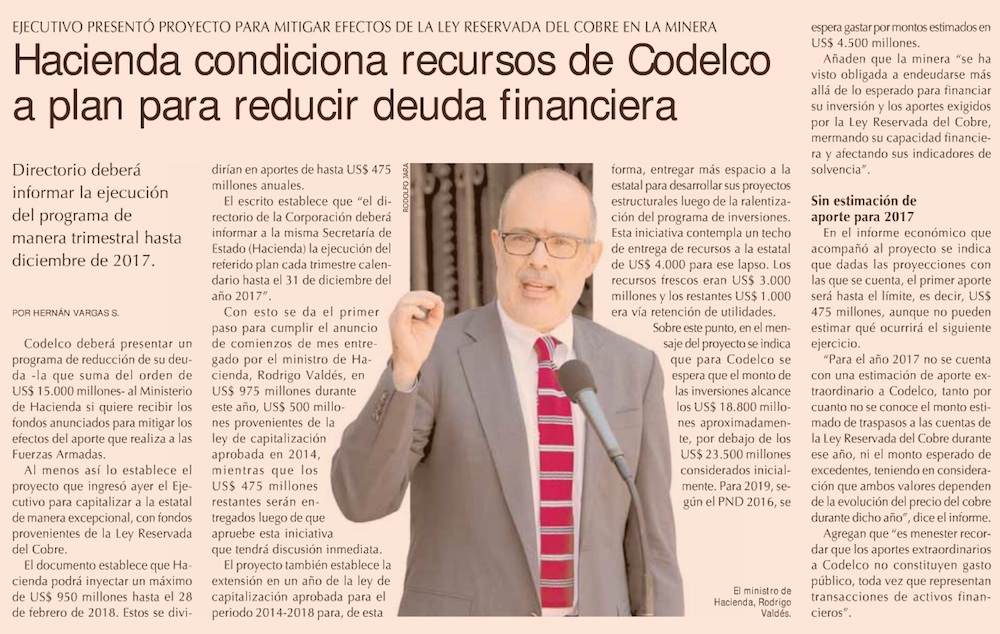 Hacienda presenta proyecto de ley para Codelco - (El Mercurio de Santiago)