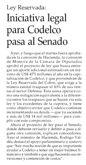 Se aprueba recursos para capitalización de Codelco - (La Tercera)