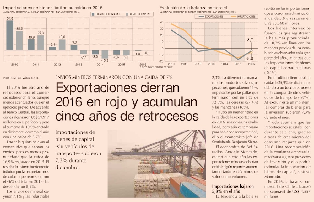 Balanza comercial de Chile tuvo superávit de US$4.557 millones en 2016 y exportación de cobre alcanzó en diciembre su mayor nivel en 2 años - (El Mostrador)
