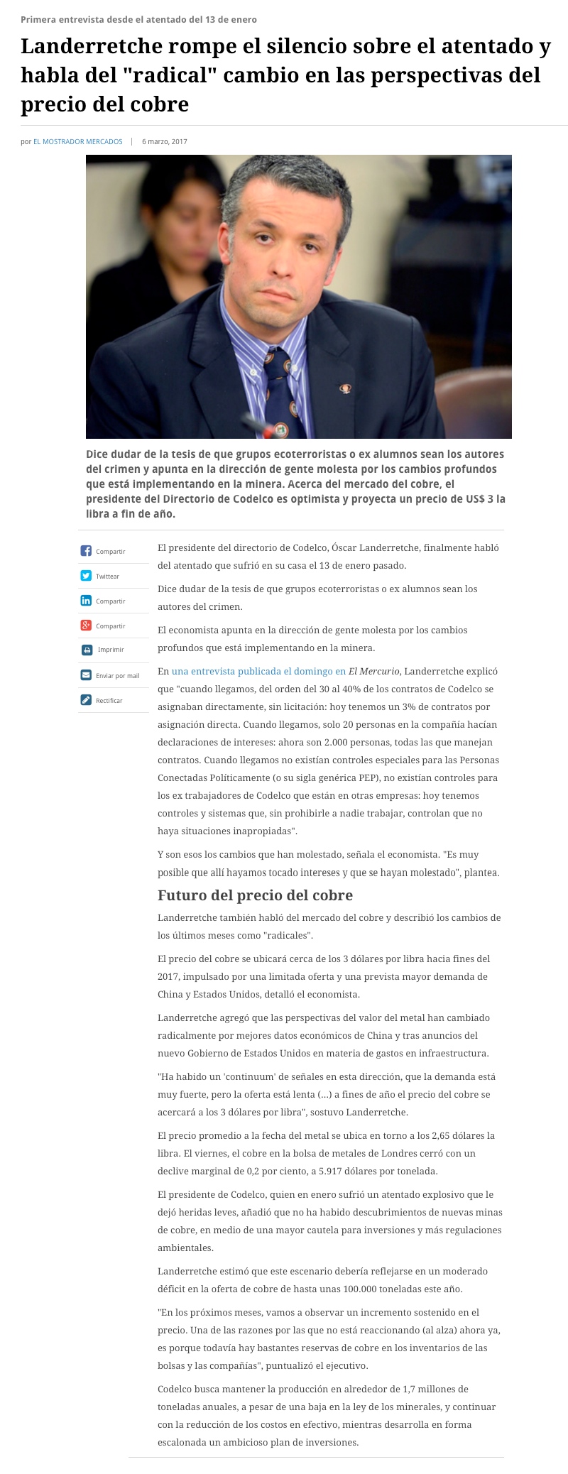 “La bomba logró el resultado contrario a lo que querían: vamos a seguir haciendo cosas en Codelco” - (El Mercurio de Santiago)