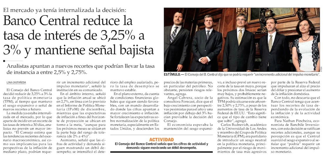 Banco Central recorta tasa de interés a 3% y modera sesgo expansivo a la espera del Ipom - (La Tercera)