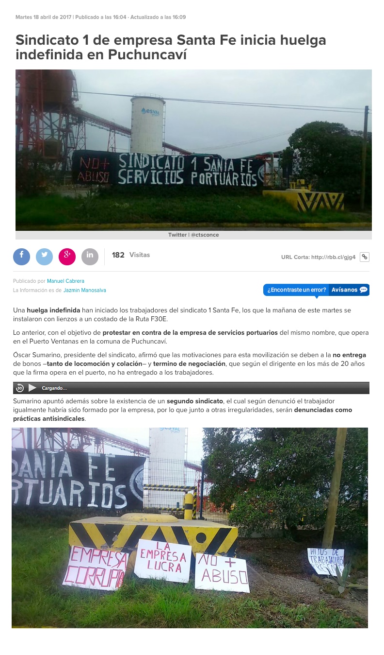 Trabajadores portuarios bloquean acceso a Puerto Ventanas en Puchuncaví - (biobiochile online)