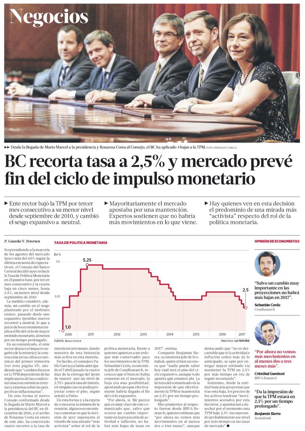 Central baja la tasa por cuarta vez este año tras un débil primer trimestre para la economía - (Diario Financiero)
