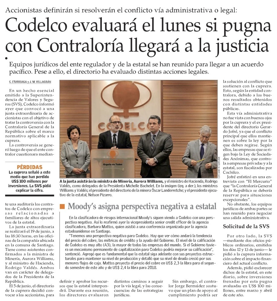 Codelco cita a junta y Cochilco apoya vía administrativa en pugna con Contraloría - (La Tercera)