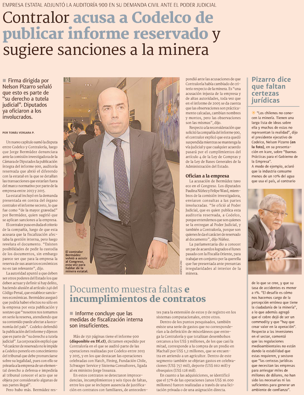 Bermúdez advierte a Codelco implicancias penales por publicación de auditoría - (El Mercurio de Santiago)